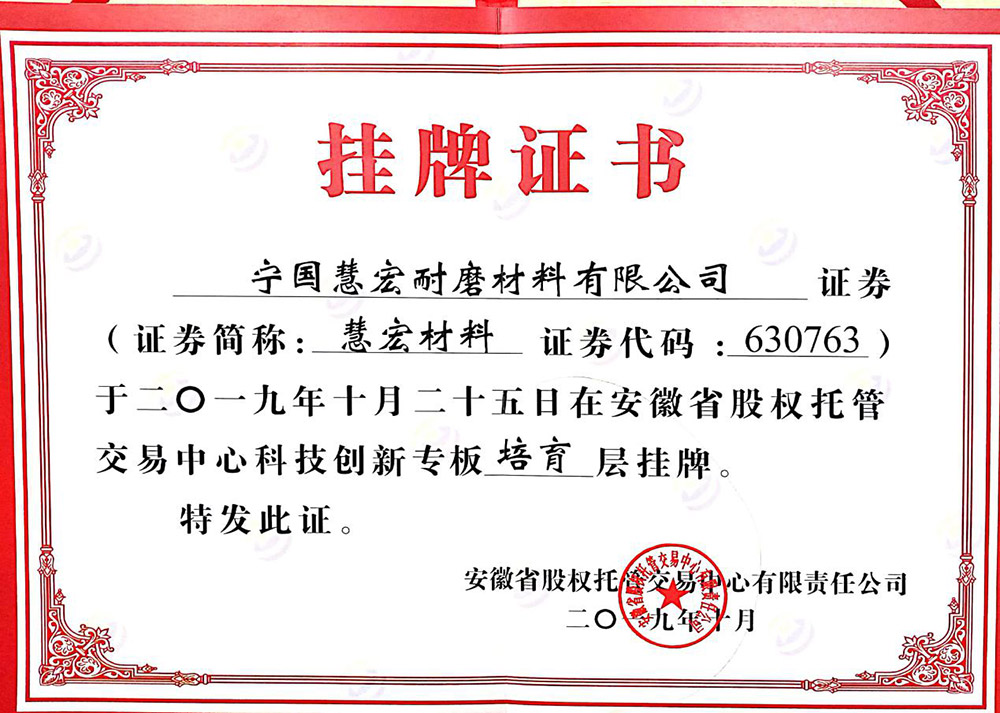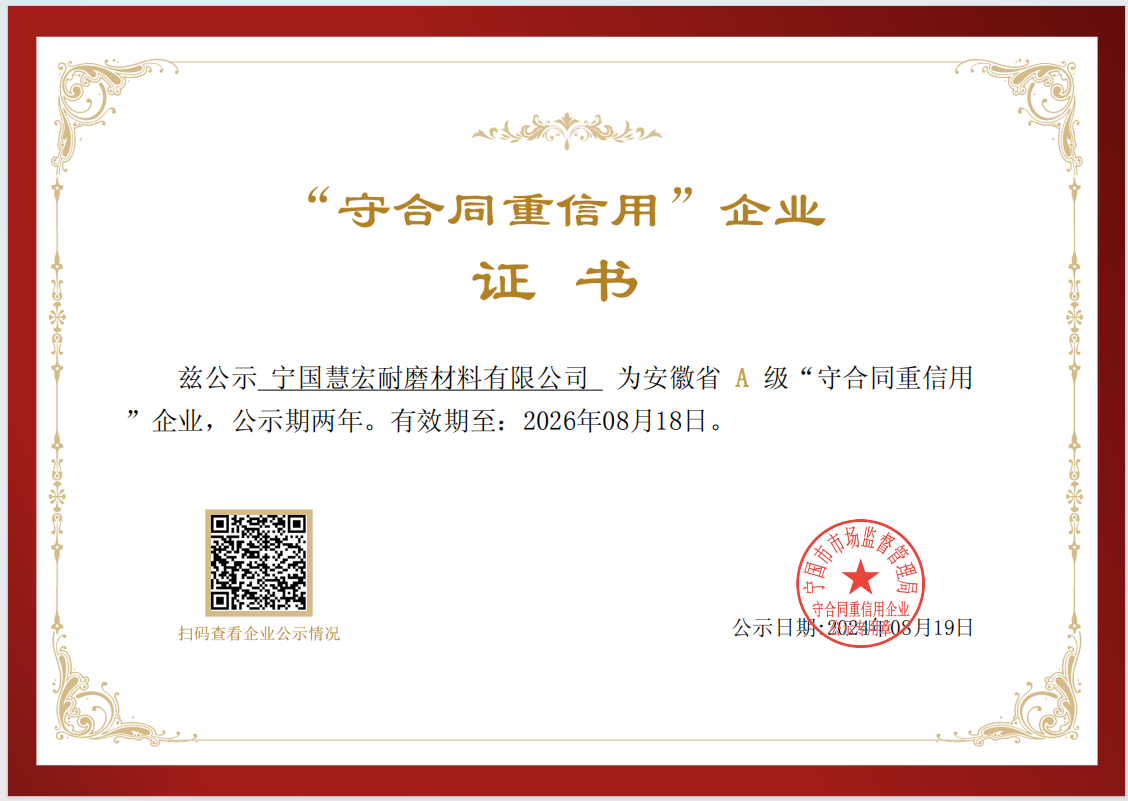 可靠的設(shè)備,才能長久穩(wěn)定運(yùn)行全面推行ISO9001;2000版質(zhì)量管理體系標(biāo)準(zhǔn),秉承“科學(xué)管理、精心制造、優(yōu)質(zhì)服務(wù)、追求卓越”的質(zhì)量方針,不斷打造高端耐磨材料產(chǎn)品。